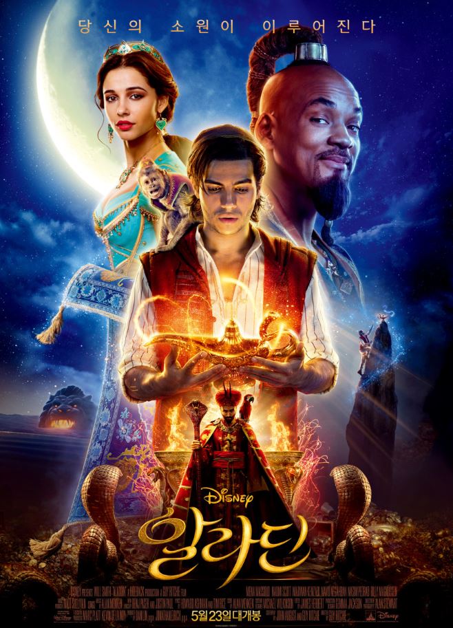 영화 알라딘은 2019년 5월 23일 개봉된 미국영화로 디즈니제작영화입니다. 1992년에 디즈니가 애니메이션 알라딘을 개봉한 후 만든 실사영화입니다. 등장인물은 알라딘역의 미나 마수드, 재스민역에 나오키 스콧, 지니역에 윌 스미스가 맡았습니다.